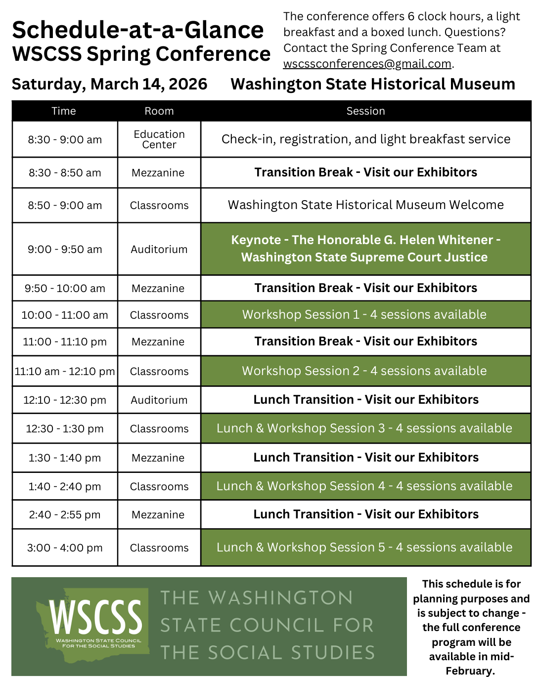 The Washington State Council for the Social Studies (WSCSS) invites you to join us for the 2026 Spring Conference at the iconic Washington State History Museum in Tacoma! This year’s theme, "Narratives of Our Nation: Stories, Strategies, and Skills for the Classroom," offers an exciting opportunity for educators to explore the enduring patterns and transformative shifts within the disciplines of Civics, Economics, Geography, History, Art, Science, and Literacy.